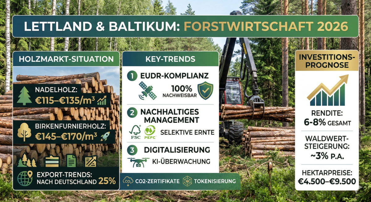 Waldinvestment Lettland 2026: Holzpreise ! März 2026 – Der Holzmarkt im Baltikum steht vor einem historischen Wendepunkt. Während die globale Nachfrage nach nachhaltigen Rohstoffen steigt, positioniert sich die Forstwirtschaft in Lettland als stabiler Ankerpunkt für Investoren und die europäische Bauindustrie. Doch was bedeutet die aktuelle EU-Gesetzgebung für die Holzpreise? In unserem Marktbericht 2026 analysieren wir […]